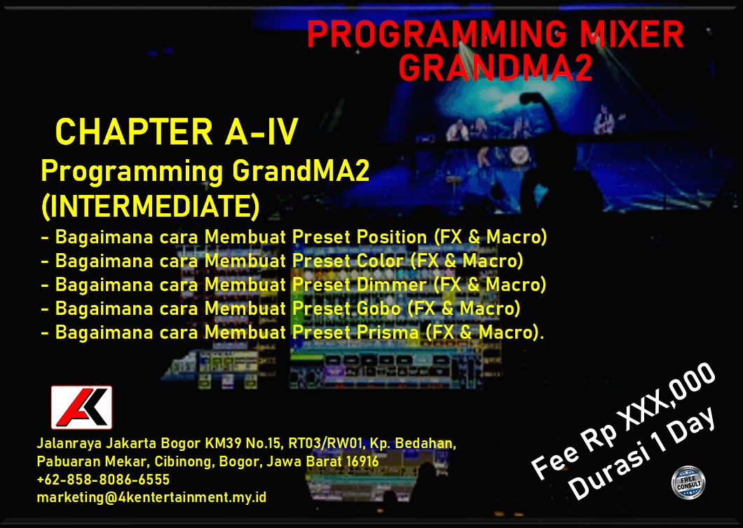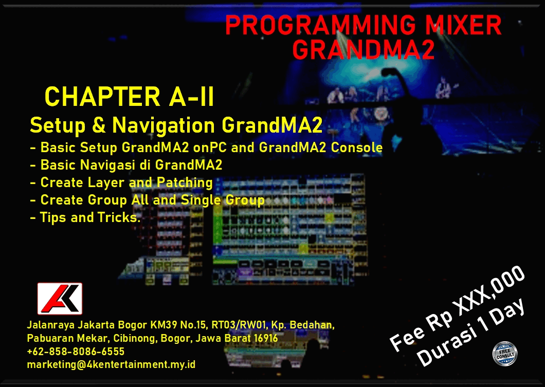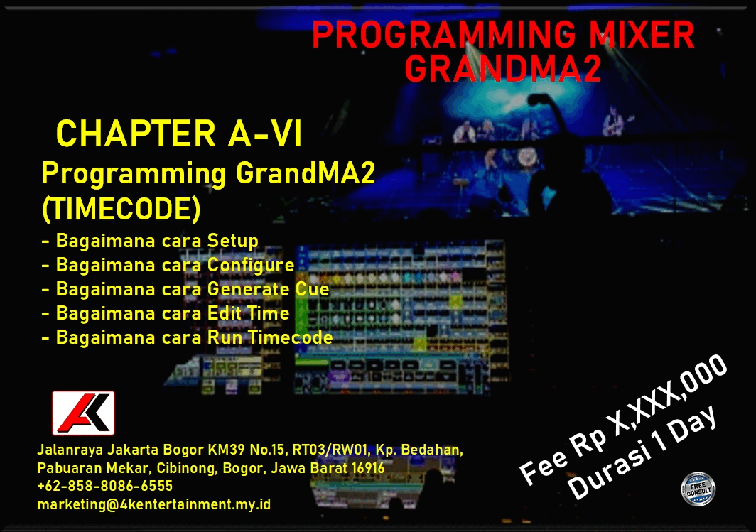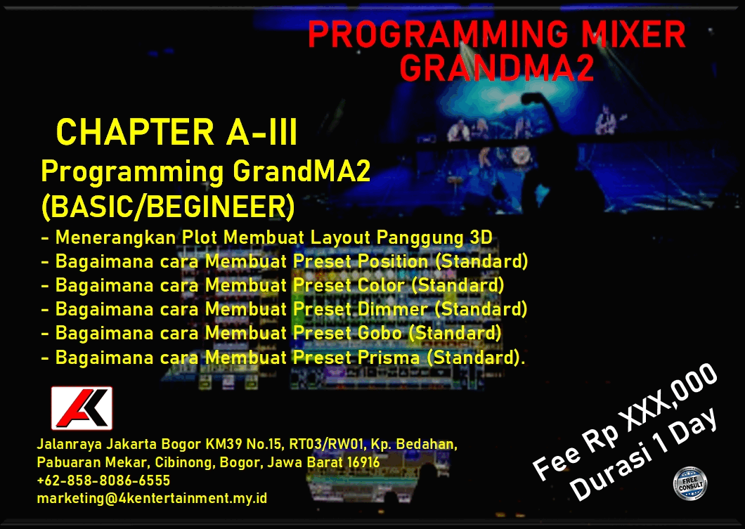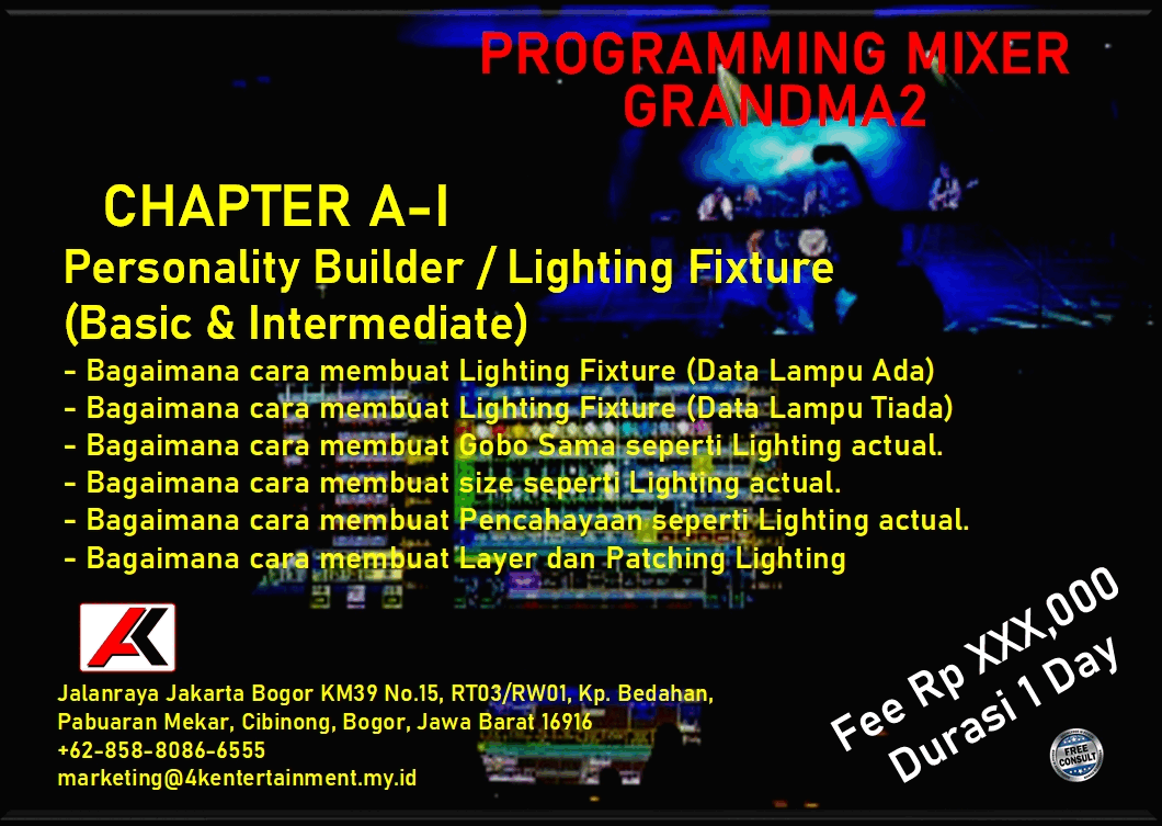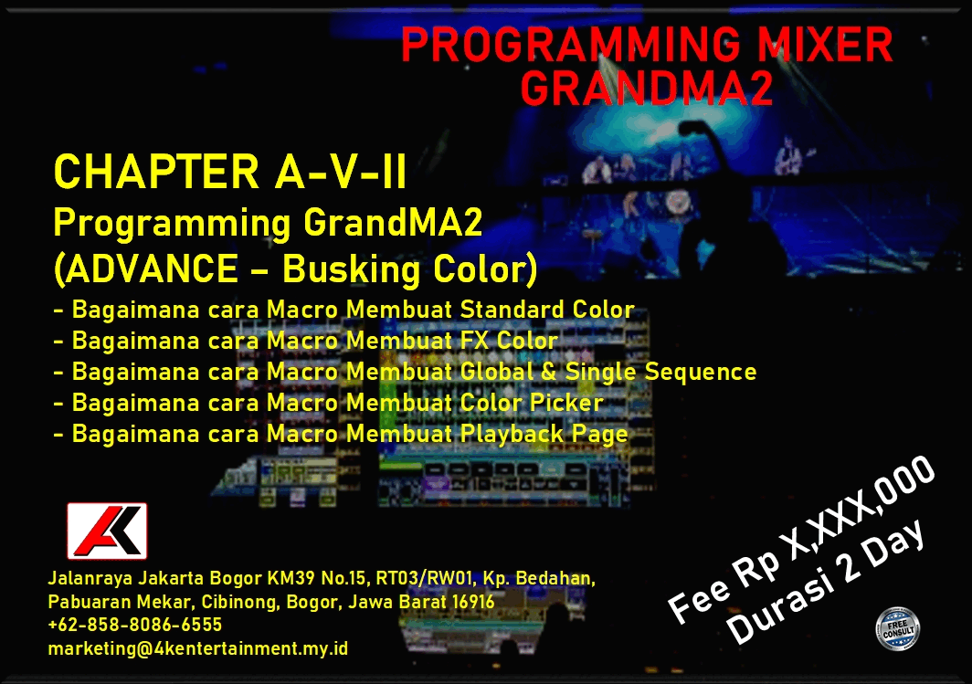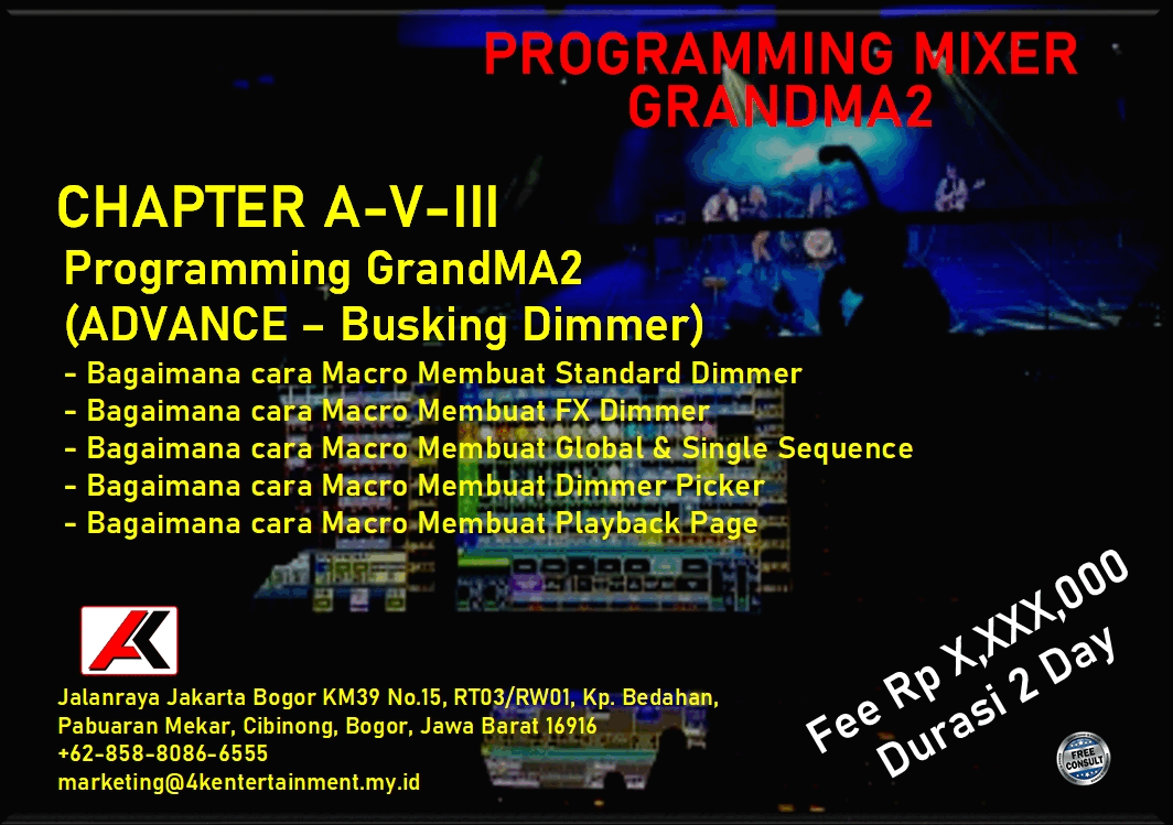 FREE CONSULTATION >> Via Email or WhatsApp SATISFACTION GUARANTEE >> Best Quality, Appearance, Design, Programming, Operator And Services. SERVICE >> Technical Support Available 24H/7D DELIVERY >> T&C To Be Apply HOME SPECIAL OFFER 4K ACADEMY SAFETY ELECTRICAL AUDIO LIGHTING SPECIAL EFFECT VIDEO RENTAL Q & A ARTICLES CONTACT US TRAINING - GENERAL LIGHTING What Is Stage Lighting & Function Stage Lighting Positions Stage Lighting Positions & Angle Stage Lighting Network & Distribution TRAINING - GrandMA2 (OnPC & Console) Personality Builder Setup & Navigation Programming (Basic) Programming (Intermediate) Programming (Busking Position) LINK TO YOUTUBE Programming (Busking Color) LINK TO YOUTUBE Programming (Busking Dimmer) LINK TO YOUTUBE Programming (Timecode) TRAINING - AVOLLITE TIGER TOUCH II Personality Builder Setup & Navigation Programming (Basic) Programming (Intermediate) Programming (Timecode) TRAINING - KING KONG 1024 Personality Builder Setup & Navigation Programming (Basic) Programming (Intermediate)