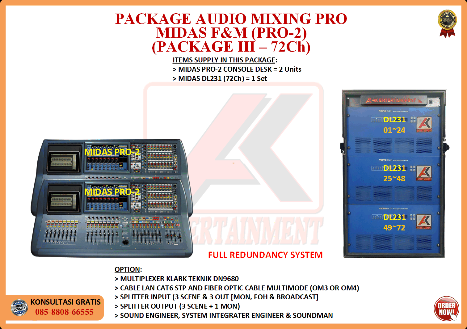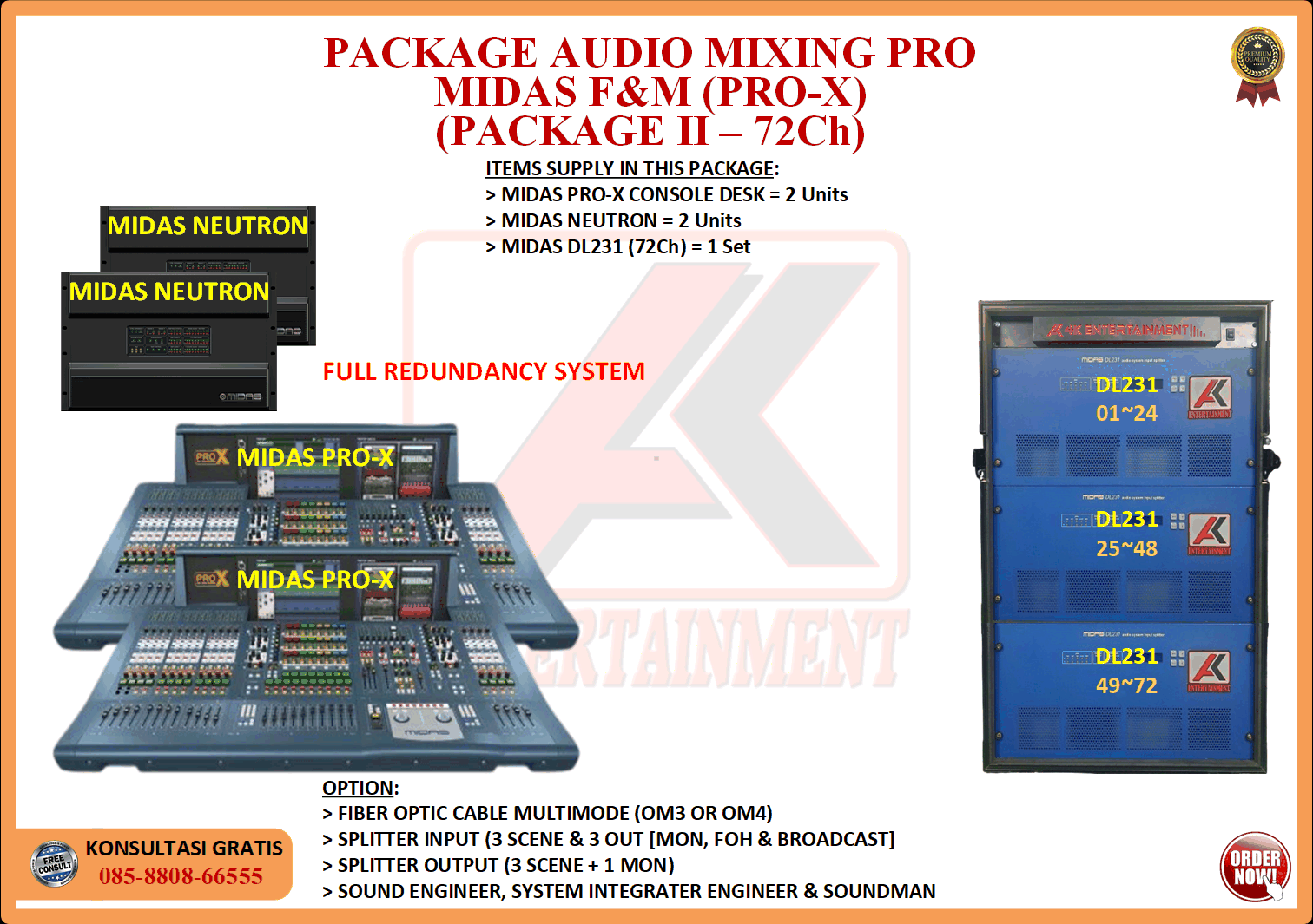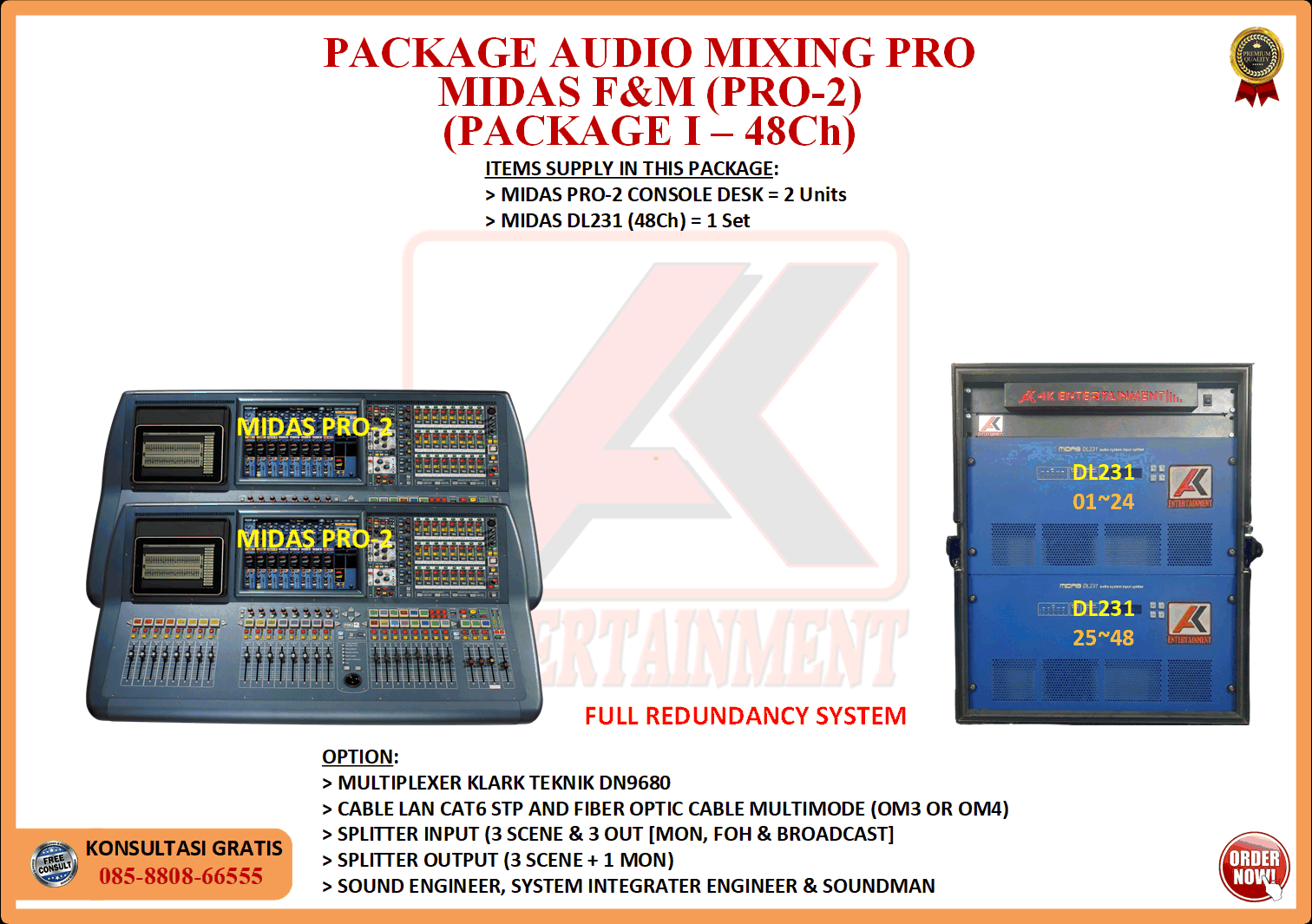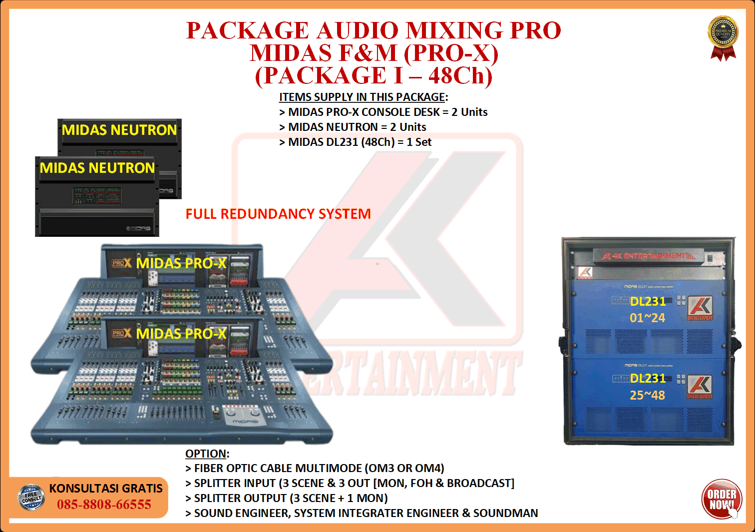 FREE CONSULTATION >> Via Email or WhatsApp SATISFACTION GUARANTEE >> Best Quality, Appearance, Design, Programming, Operator And Services. SERVICE >> Technical Support Available 24H/7D DELIVERY >> T&C To Be Apply HOME SPECIAL OFFER 4K ACADEMY RENTAL – 4K ENTERTAINMENT CUSTOM REQUEST AUDIO MIXING Accessories Digital I/O’s Rack Pkg YAMAHA Pkg MIDAS SOUND SYSTEM IN-EAR MONITOR MICROPHONE COMBINER & SPLITTER BACKLINE DMX-512 LIGHTING SPECIAL EFFECT MULTIMEDIA COMMUNICATION DISC JOCKEY EVENT SUPPORT PARTY EQUIPMENT SAFETY/PROTECTION RIGGING/STAGE PACKAGE DIGITAL MIXING CONSOLES - YAMAHA PKG CL3-I Rp POA /Hari PKG CL3-II Rp POA /Hari PKG CL3-III Rp POA /Hari PKG CL3-IV Rp POA /Hari PKG CL5-I Rp POA /Hari PKG CL5-II Rp POA /Hari PKG CL5-III Rp POA /Hari PKG CL5-IV Rp POA /Hari PKG CL5-V Rp POA /Hari PKG CL5-VI Rp POA /Hari PKG VVIP-A Rp POA /Hari PKG VVIP-B Rp POA /Hari PKG VVIP-C Rp POA /Hari PKG VVIP-D Rp POA /Hari PACKAGE DIGITAL MIXING CONSOLES - MIDAS F/M PRO2-I Rp POA /Hari F/M PRO2-II Rp POA /Hari F/M PRO2-III Rp POA /Hari F&M PRO2-I Rp POA /Hari F&M PRO2-II Rp POA /Hari F&M PRO2-III Rp POA /Hari F/M PROX-I Rp POA /Hari F/M PROX-II Rp POA /Hari F/M PROX-III Rp POA /Hari F&M PROX-I Rp POA /Hari F&M PROX-II Rp POA /Hari F&M PROX-III Rp POA /Hari F&M PROX-IV Rp POA /Hari F&M PROX-V Rp POA /Hari OPTION SCOPE OF WORK;> Installation and Setup System Network Fully Functional.> Configure System Of Audio Mixing> Line Check Digital Snake To/From Mixing Console Fully Functional. If 4K Provide Sub-Snake or Splitter, so Line Check will be included.> When System Fully Check and Ready, Team 4K will handover to CLIENT. If Operator & System Engineer from 4K, 4K will be Responsible for all scope of works. BACA CARA-CARA UNTUK MEMESAN SEWA READ HOW TO BOOK A RENTAL
