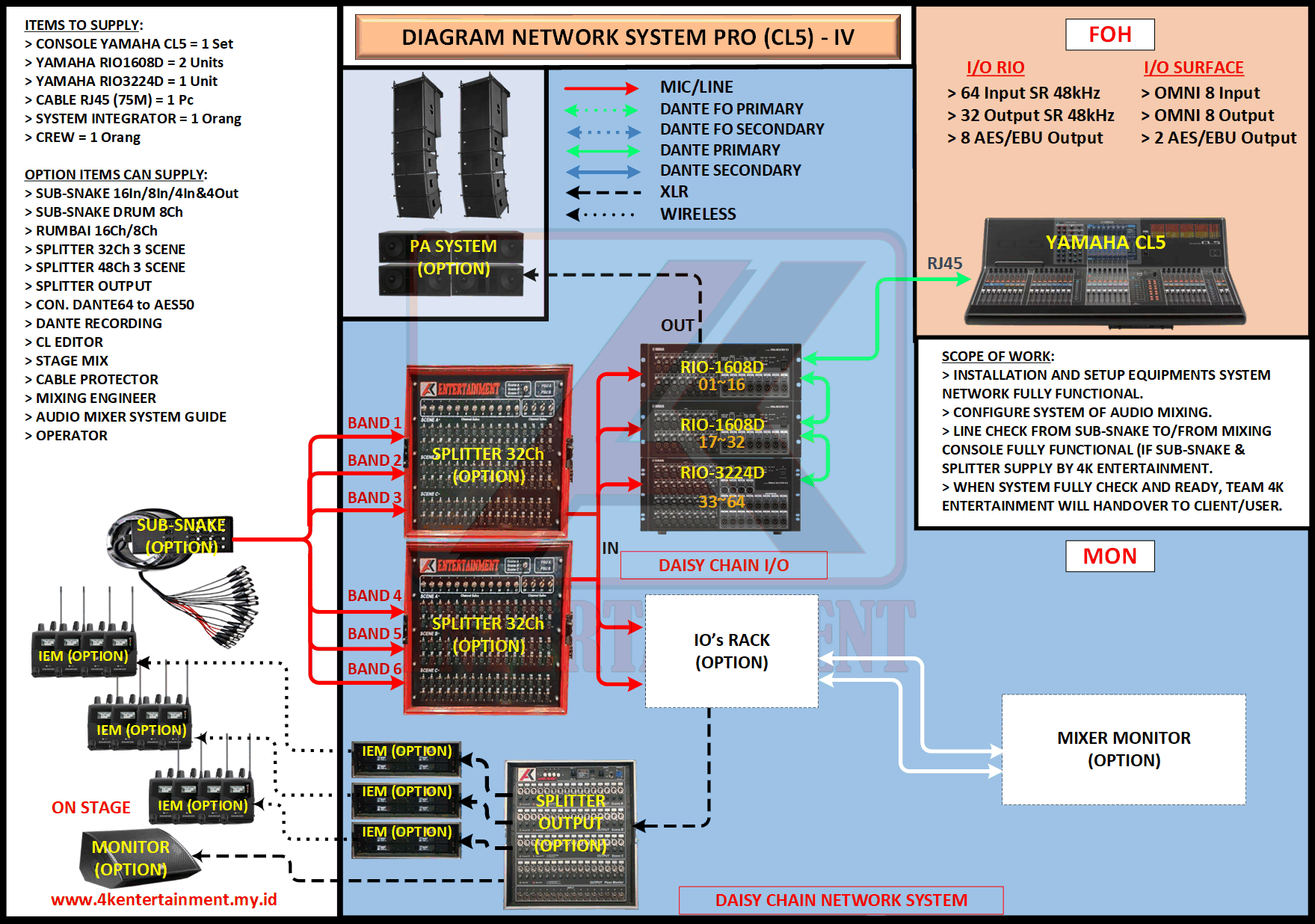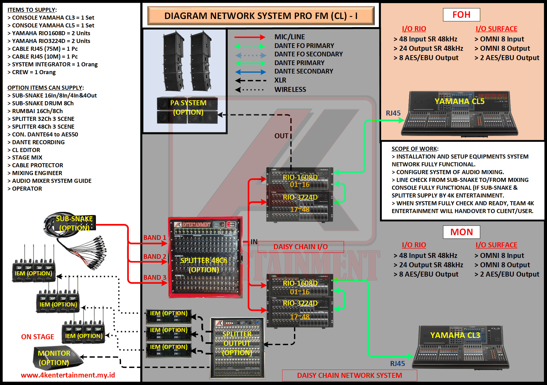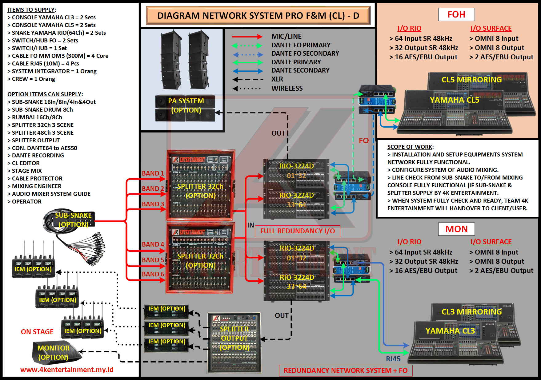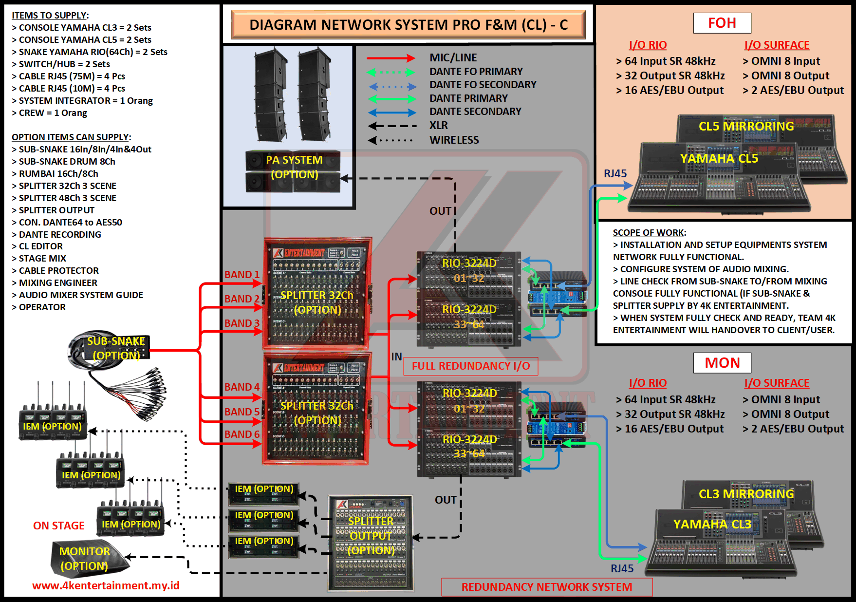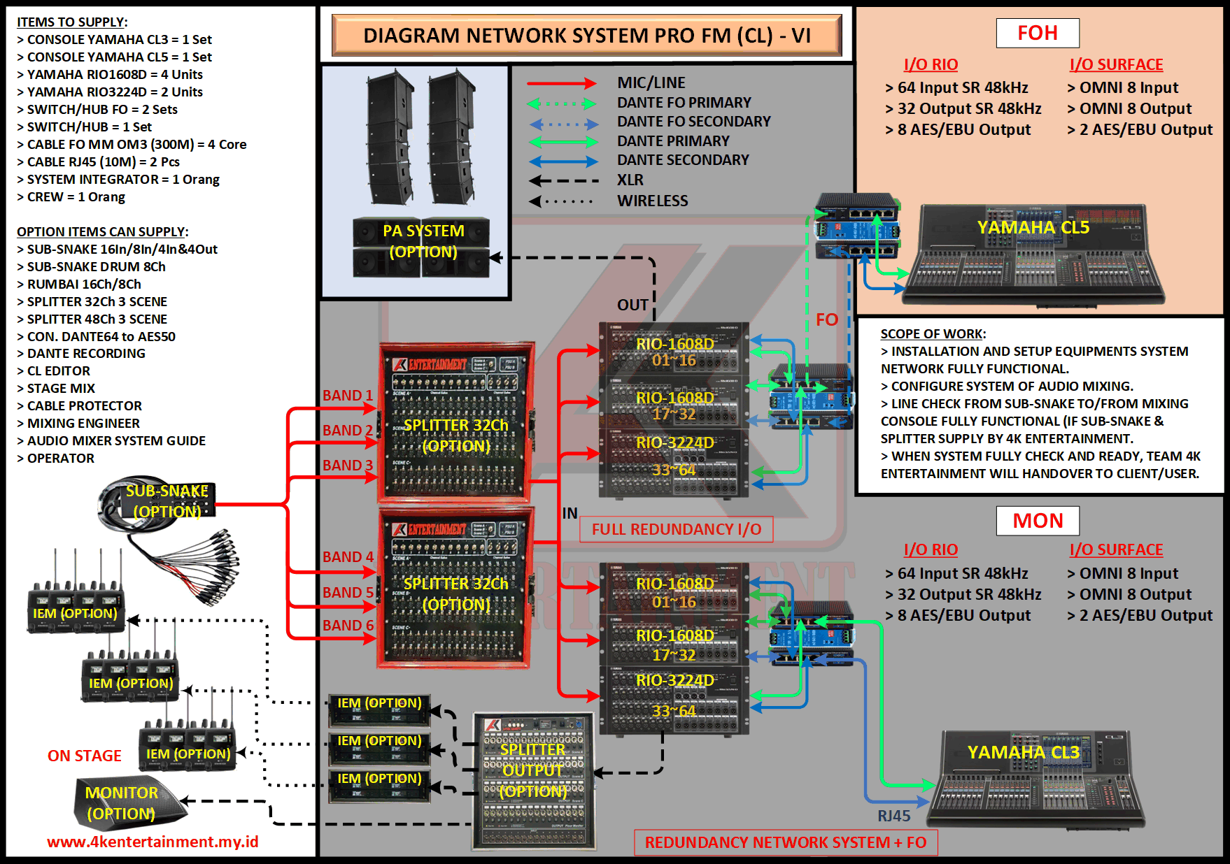 FREE CONSULTATION >> Via Email or WhatsApp SATISFACTION GUARANTEE >> Best Quality, Appearance, Design, Programming, Operator And Services. SERVICE >> Technical Support Available 24H/7D DELIVERY >> T&C To Be Apply HOME SPECIAL OFFER 4K ACADEMY RENTAL – 4K ENTERTAINMENT CUSTOM REQUEST AUDIO MIXING Accessories Digital I/O’s Rack Pkg YAMAHA Pkg MIDAS SOUND SYSTEM IN-EAR MONITOR MICROPHONE COMBINER & SPLITTER BACKLINE DMX-512 LIGHTING SPECIAL EFFECT MULTIMEDIA COMMUNICATION DISC JOCKEY EVENT SUPPORT PARTY EQUIPMENT SAFETY/PROTECTION RIGGING/STAGE MIXING CONSOLES (INFORMATION) MIXER YAMAHA YAMAHA DIGITAL RACK RENTAL EQUIPMENTS ONLY PKG CL3-I Rp POA /Hari PKG CL3-II Rp POA /Hari PKG CL3-III Rp POA /Hari PKG CL3-IV Rp POA /Hari PKG CL5-I Rp POA /Hari PKG CL5-II Rp POA /Hari PKG CL5-III Rp POA /Hari PKG CL5-IV Rp POA /Hari PKG CL5-V Rp POA /Hari PKG CL5-VI Rp POA /Hari PACKAGE MIXING CONSOLES (FOH/MON) - YAMAHA CL3 Pkg (CL3) F/M I Rp POA /Hari Pkg (CL3) F/M II Rp POA /Hari Pkg (CL3) F/M III Rp POA /Hari Pkg (CL3) F/M IV Rp POA /Hari PACKAGE MIXING CONSOLES (FOH/MON) - YAMAHA CL5 Pkg (CL5) F/M I Rp POA /Hari Pkg (CL5) F/M II Rp POA /Hari Pkg (CL5) F/M III Rp POA /Hari Pkg (CL5) F/M IV Rp POA /Hari Pkg (CL5) F/M V Rp POA /Hari Pkg (CL5) F/M VI Rp POA /Hari PACKAGE MIXING CONSOLES PROFESSIONAL (FOH & MONITOR) - YAMAHA CL3 & CL5 Pkg (CL) F&M I Rp POA /Hari Pkg (CL) F&M II Rp POA /Hari Pkg (CL) F&M III Rp POA /Hari Pkg (CL) F&M IV Rp POA /Hari Pkg (CL) F&M V Rp POA /Hari Pkg (CL) F&M VI Rp POA /Hari PACKAGE MIXING CONSOLES PRO EVENT VVIP (FOH & MONITOR) - YAMAHA CL3 & CL5 Pkg (CL-VVIP) F&M A Rp POA /Hari Pkg (CL-VVIP) F&M B Rp POA /Hari Pkg (CL-VVIP) F&M C Rp POA /Hari Pkg (CL-VVIP) F&M D Rp POA /Hari SCOPE OF WORK;> SUPPLY ITEMS As Per AGREED Purchase Order / Agreement.> Installation and Setup System Network Fully Functional.> Configure System Of Audio Mixing> Line Check Digital Snake To/From Mixing Console Fully Functional. If 4K Provide Sub-Snake or Splitter, so Line Check will be included.> When System Fully Check and Ready, Team 4K will handover to CLIENT. If Operator & System Engineer from 4K, 4K will be Responsible for all scope of works. BACA CARA-CARA UNTUK MEMESAN SEWA READ HOW TO BOOK A RENTAL