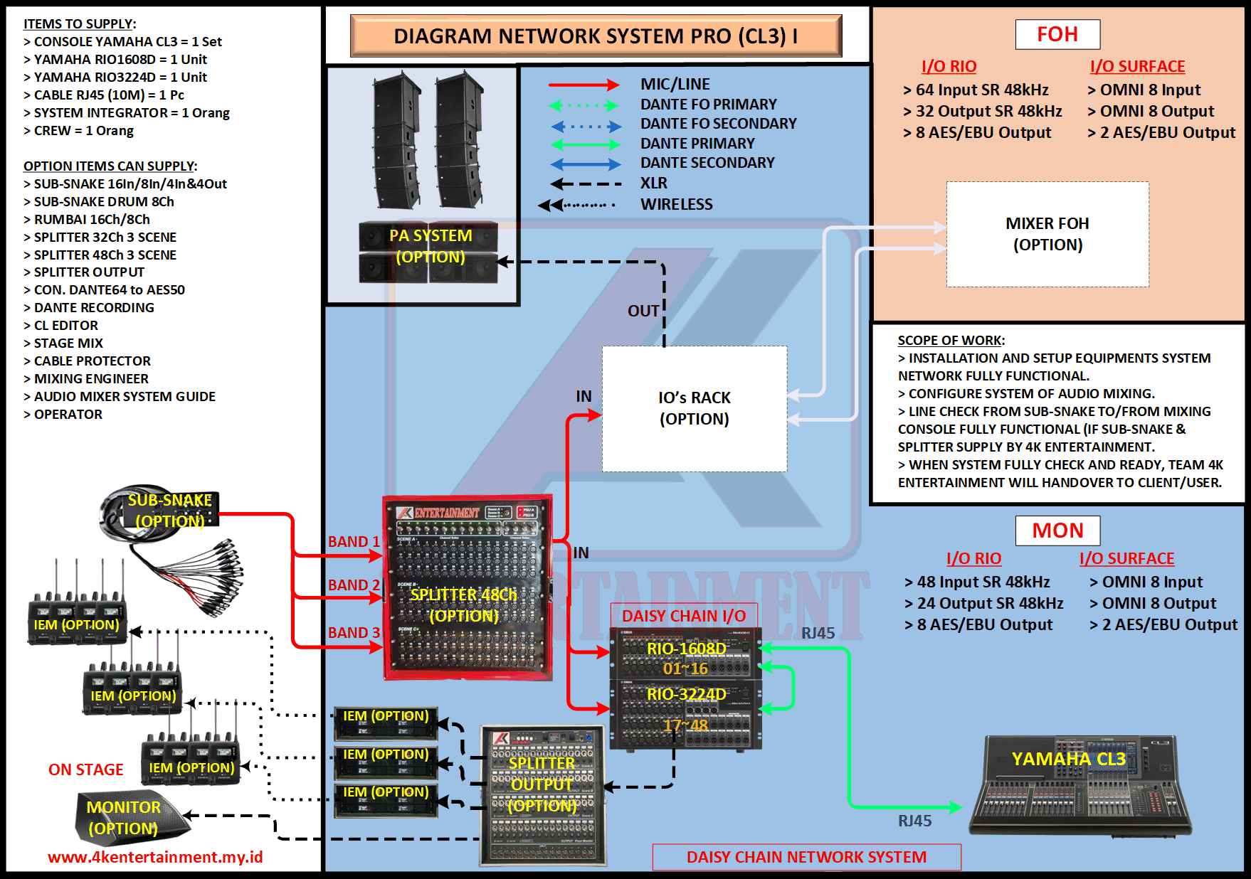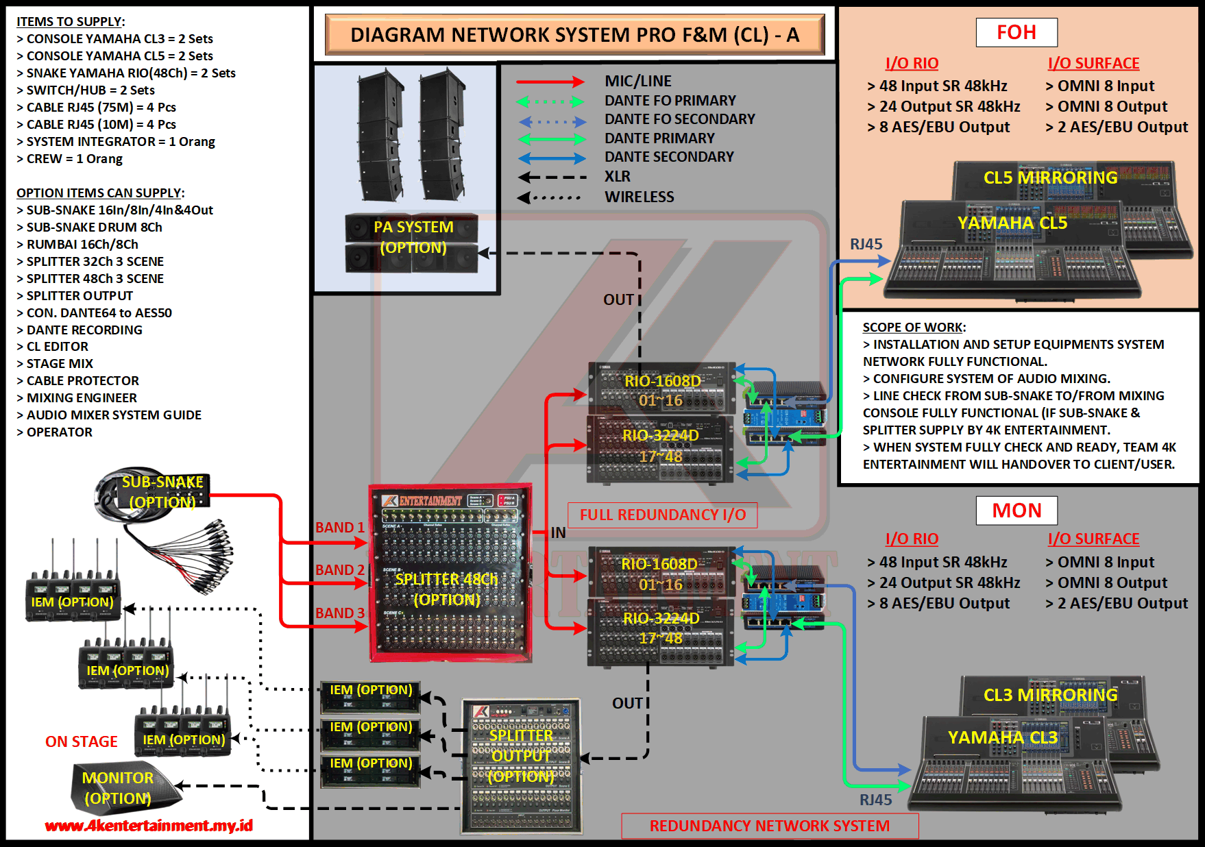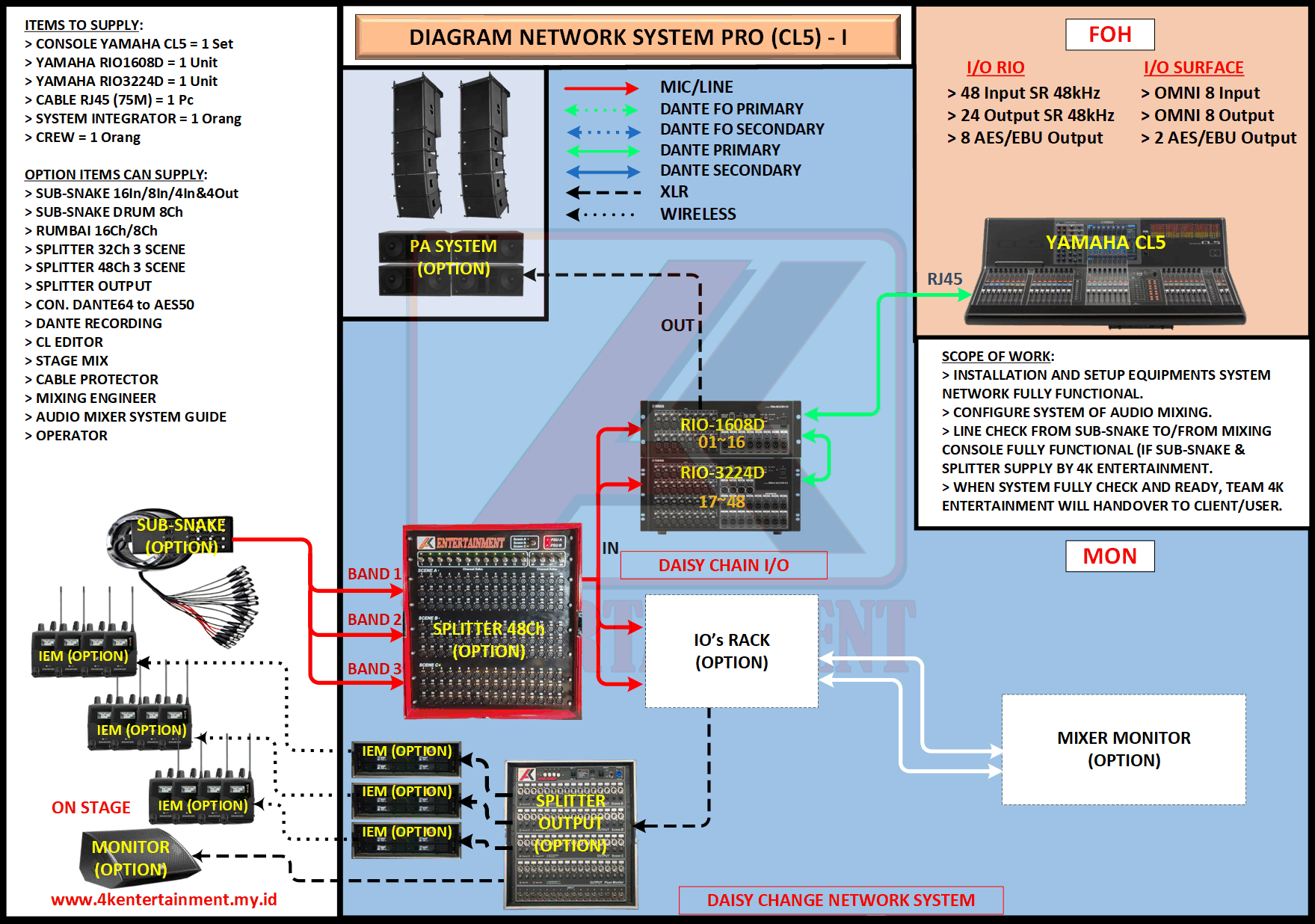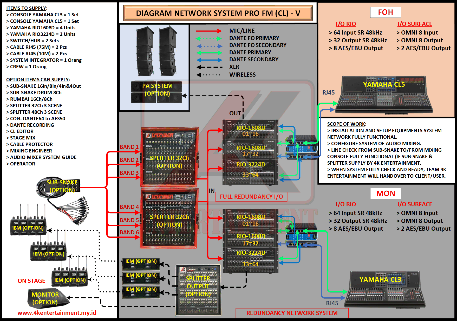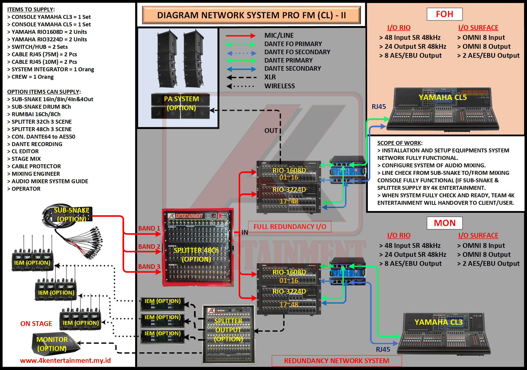 FREE CONSULTATION >> Via Email or WhatsApp SATISFACTION GUARANTEE >> Best Quality, Appearance, Design, Programming, Operator And Services. SERVICE >> Technical Support Available 24H/7D DELIVERY >> T&C To Be Apply HOME SPECIAL OFFER 4K ACADEMY RENTAL – 4K ENTERTAINMENT CUSTOM REQUEST AUDIO MIXING Accessories Digital I/O’s Rack Pkg YAMAHA Pkg MIDAS SOUND SYSTEM IN-EAR MONITOR MICROPHONE COMBINER & SPLITTER BACKLINE DMX-512 LIGHTING SPECIAL EFFECT MULTIMEDIA COMMUNICATION DISC JOCKEY EVENT SUPPORT PARTY EQUIPMENT SAFETY/PROTECTION RIGGING/STAGE MIXING CONSOLES (INFORMATION) MIXER YAMAHA YAMAHA DIGITAL RACK RENTAL EQUIPMENTS ONLY PKG CL3-I Rp POA /Hari PKG CL3-II Rp POA /Hari PKG CL3-III Rp POA /Hari PKG CL3-IV Rp POA /Hari PKG CL5-I Rp POA /Hari PKG CL5-II Rp POA /Hari PKG CL5-III Rp POA /Hari PKG CL5-IV Rp POA /Hari PKG CL5-V Rp POA /Hari PKG CL5-VI Rp POA /Hari PACKAGE MIXING CONSOLES (FOH/MON) - YAMAHA CL3 Pkg (CL3) F/M I Rp POA /Hari Pkg (CL3) F/M II Rp POA /Hari Pkg (CL3) F/M III Rp POA /Hari Pkg (CL3) F/M IV Rp POA /Hari PACKAGE MIXING CONSOLES (FOH/MON) - YAMAHA CL5 Pkg (CL5) F/M I Rp POA /Hari Pkg (CL5) F/M II Rp POA /Hari Pkg (CL5) F/M III Rp POA /Hari Pkg (CL5) F/M IV Rp POA /Hari Pkg (CL5) F/M V Rp POA /Hari Pkg (CL5) F/M VI Rp POA /Hari PACKAGE MIXING CONSOLES PROFESSIONAL (FOH & MONITOR) - YAMAHA CL3 & CL5 Pkg (CL) F&M I Rp POA /Hari Pkg (CL) F&M II Rp POA /Hari Pkg (CL) F&M III Rp POA /Hari Pkg (CL) F&M IV Rp POA /Hari Pkg (CL) F&M V Rp POA /Hari Pkg (CL) F&M VI Rp POA /Hari PACKAGE MIXING CONSOLES PRO EVENT VVIP (FOH & MONITOR) - YAMAHA CL3 & CL5 Pkg (CL-VVIP) F&M A Rp POA /Hari Pkg (CL-VVIP) F&M B Rp POA /Hari Pkg (CL-VVIP) F&M C Rp POA /Hari Pkg (CL-VVIP) F&M D Rp POA /Hari SCOPE OF WORK;> SUPPLY ITEMS As Per AGREED Purchase Order / Agreement.> Installation and Setup System Network Fully Functional.> Configure System Of Audio Mixing> Line Check Digital Snake To/From Mixing Console Fully Functional. If 4K Provide Sub-Snake or Splitter, so Line Check will be included.> When System Fully Check and Ready, Team 4K will handover to CLIENT. If Operator & System Engineer from 4K, 4K will be Responsible for all scope of works. BACA CARA-CARA UNTUK MEMESAN SEWA READ HOW TO BOOK A RENTAL