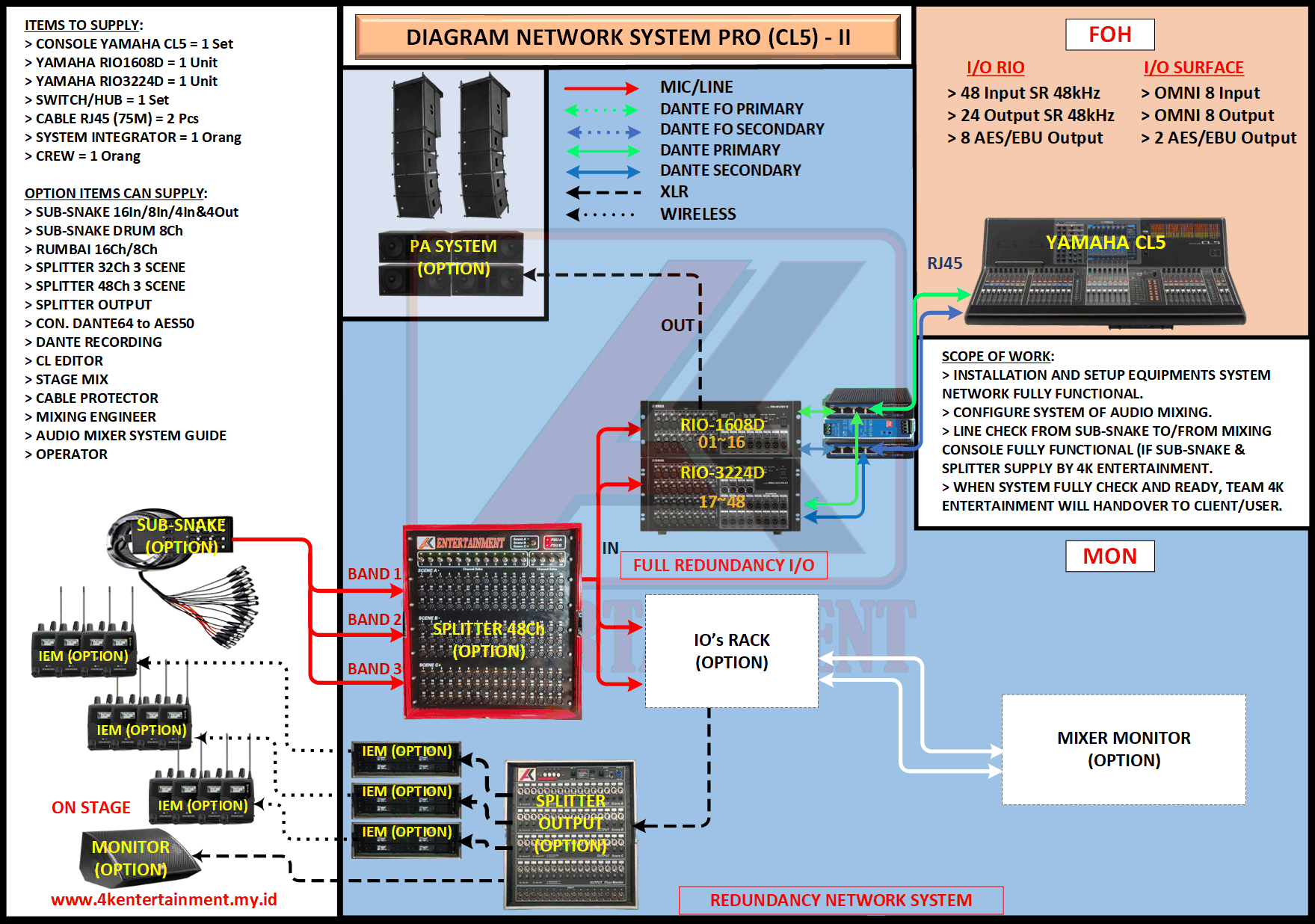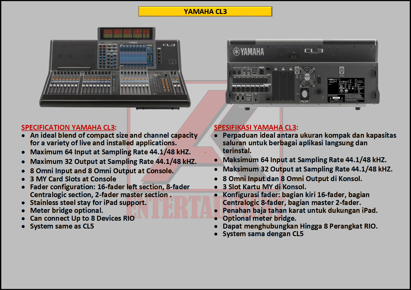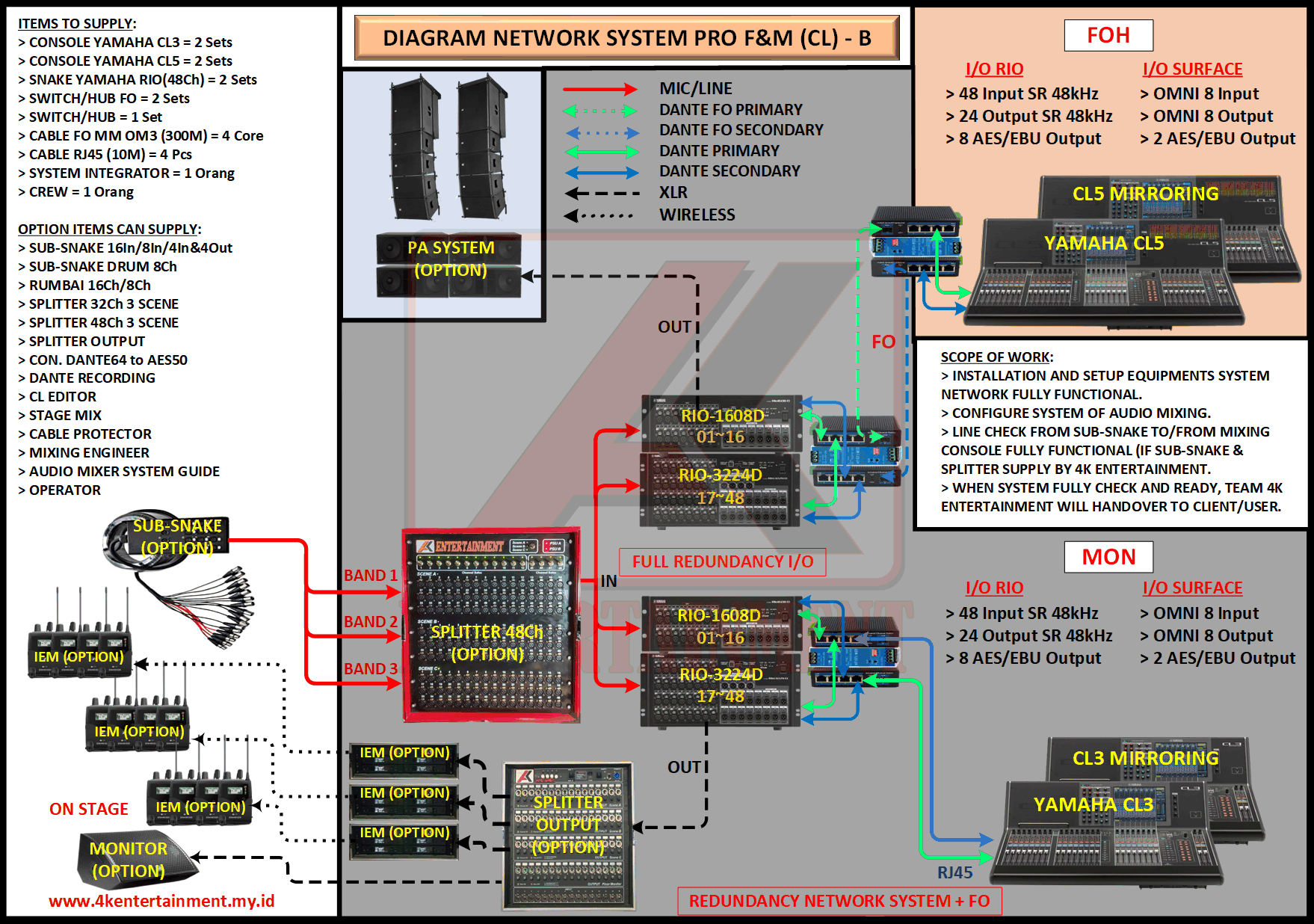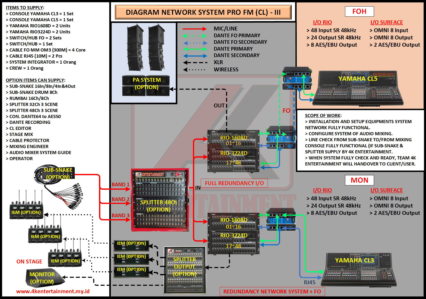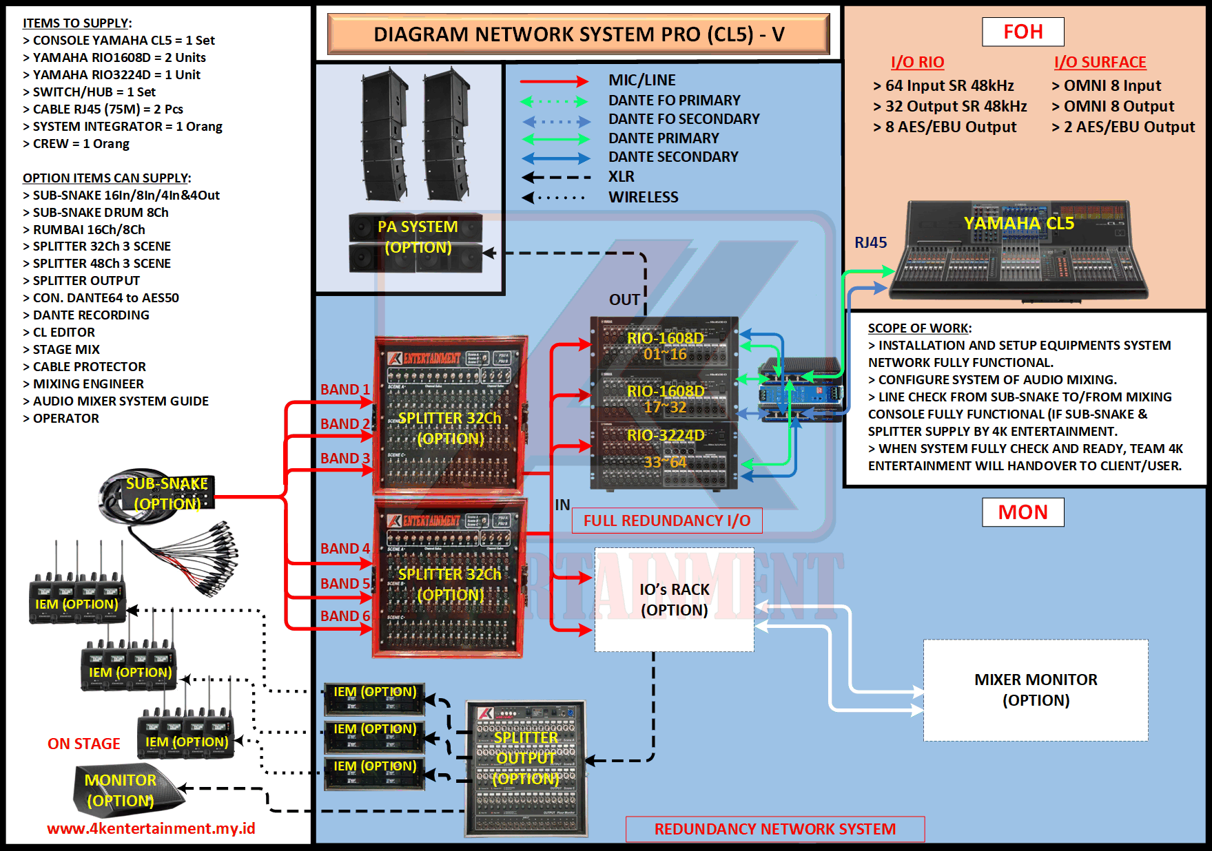 FREE CONSULTATION >> Via Email or WhatsApp SATISFACTION GUARANTEE >> Best Quality, Appearance, Design, Programming, Operator And Services. SERVICE >> Technical Support Available 24H/7D DELIVERY >> T&C To Be Apply HOME SPECIAL OFFER 4K ACADEMY RENTAL – 4K ENTERTAINMENT CUSTOM REQUEST AUDIO MIXING Accessories Digital I/O’s Rack Pkg YAMAHA Pkg MIDAS SOUND SYSTEM IN-EAR MONITOR MICROPHONE COMBINER & SPLITTER BACKLINE DMX-512 LIGHTING SPECIAL EFFECT MULTIMEDIA COMMUNICATION DISC JOCKEY EVENT SUPPORT PARTY EQUIPMENT SAFETY/PROTECTION RIGGING/STAGE MIXING CONSOLES (INFORMATION) MIXER YAMAHA YAMAHA DIGITAL RACK RENTAL EQUIPMENTS ONLY PKG CL3-I Rp POA /Hari PKG CL3-II Rp POA /Hari PKG CL3-III Rp POA /Hari PKG CL3-IV Rp POA /Hari PKG CL5-I Rp POA /Hari PKG CL5-II Rp POA /Hari PKG CL5-III Rp POA /Hari PKG CL5-IV Rp POA /Hari PKG CL5-V Rp POA /Hari PKG CL5-VI Rp POA /Hari PACKAGE MIXING CONSOLES (FOH/MON) - YAMAHA CL3 Pkg (CL3) F/M I Rp POA /Hari Pkg (CL3) F/M II Rp POA /Hari Pkg (CL3) F/M III Rp POA /Hari Pkg (CL3) F/M IV Rp POA /Hari PACKAGE MIXING CONSOLES (FOH/MON) - YAMAHA CL5 Pkg (CL5) F/M I Rp POA /Hari Pkg (CL5) F/M II Rp POA /Hari Pkg (CL5) F/M III Rp POA /Hari Pkg (CL5) F/M IV Rp POA /Hari Pkg (CL5) F/M V Rp POA /Hari Pkg (CL5) F/M VI Rp POA /Hari PACKAGE MIXING CONSOLES PROFESSIONAL (FOH & MONITOR) - YAMAHA CL3 & CL5 Pkg (CL) F&M I Rp POA /Hari Pkg (CL) F&M II Rp POA /Hari Pkg (CL) F&M III Rp POA /Hari Pkg (CL) F&M IV Rp POA /Hari Pkg (CL) F&M V Rp POA /Hari Pkg (CL) F&M VI Rp POA /Hari PACKAGE MIXING CONSOLES PRO EVENT VVIP (FOH & MONITOR) - YAMAHA CL3 & CL5 Pkg (CL-VVIP) F&M A Rp POA /Hari Pkg (CL-VVIP) F&M B Rp POA /Hari Pkg (CL-VVIP) F&M C Rp POA /Hari Pkg (CL-VVIP) F&M D Rp POA /Hari SCOPE OF WORK;> SUPPLY ITEMS As Per AGREED Purchase Order / Agreement.> Installation and Setup System Network Fully Functional.> Configure System Of Audio Mixing> Line Check Digital Snake To/From Mixing Console Fully Functional. If 4K Provide Sub-Snake or Splitter, so Line Check will be included.> When System Fully Check and Ready, Team 4K will handover to CLIENT. If Operator & System Engineer from 4K, 4K will be Responsible for all scope of works. BACA CARA-CARA UNTUK MEMESAN SEWA READ HOW TO BOOK A RENTAL