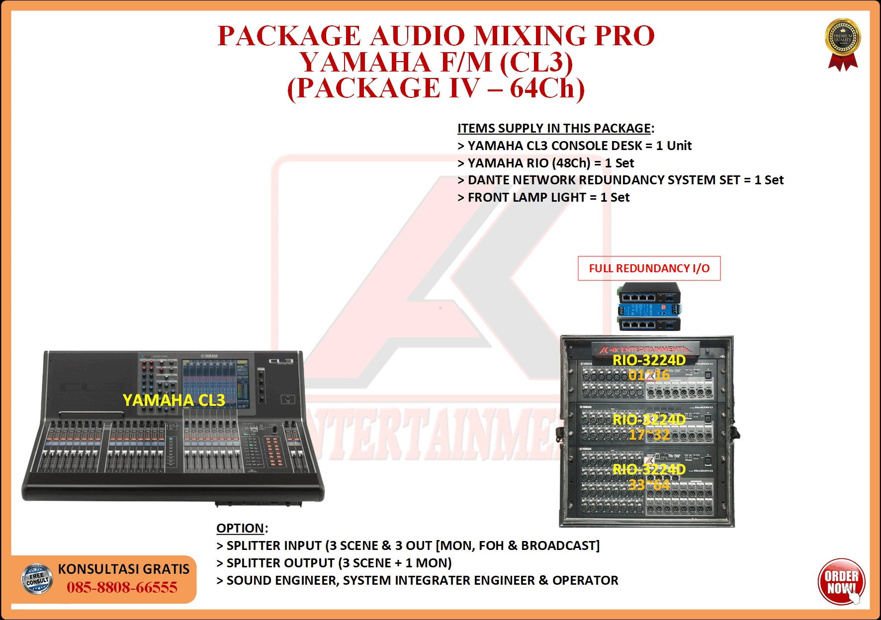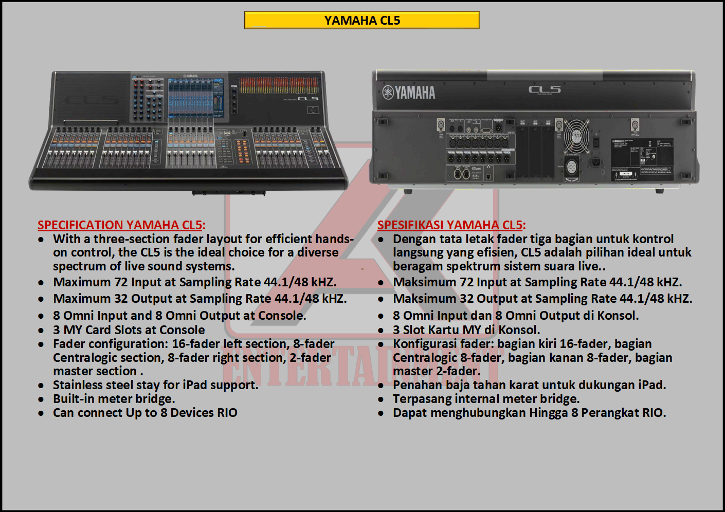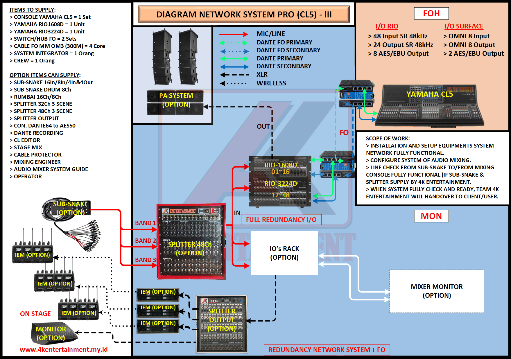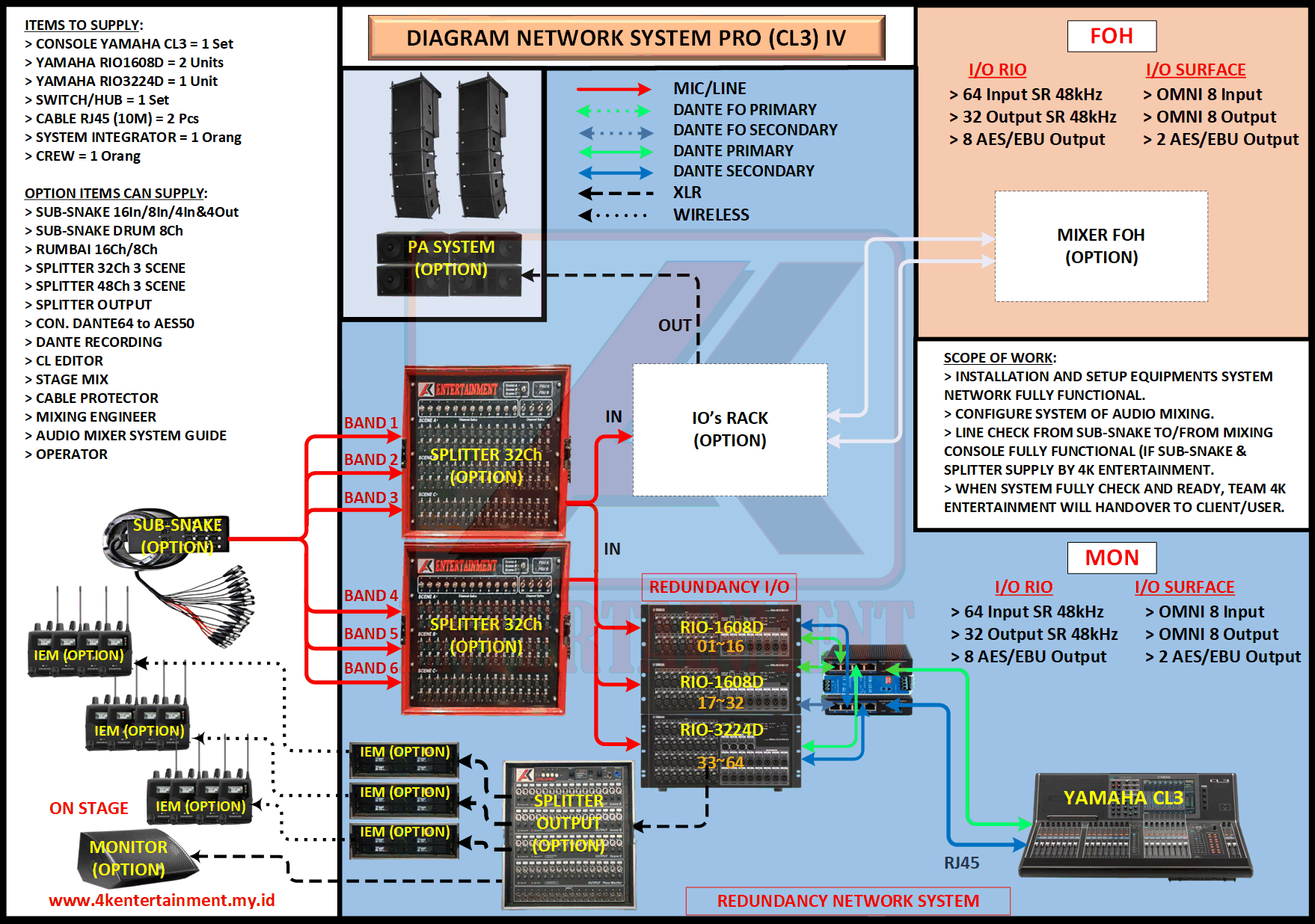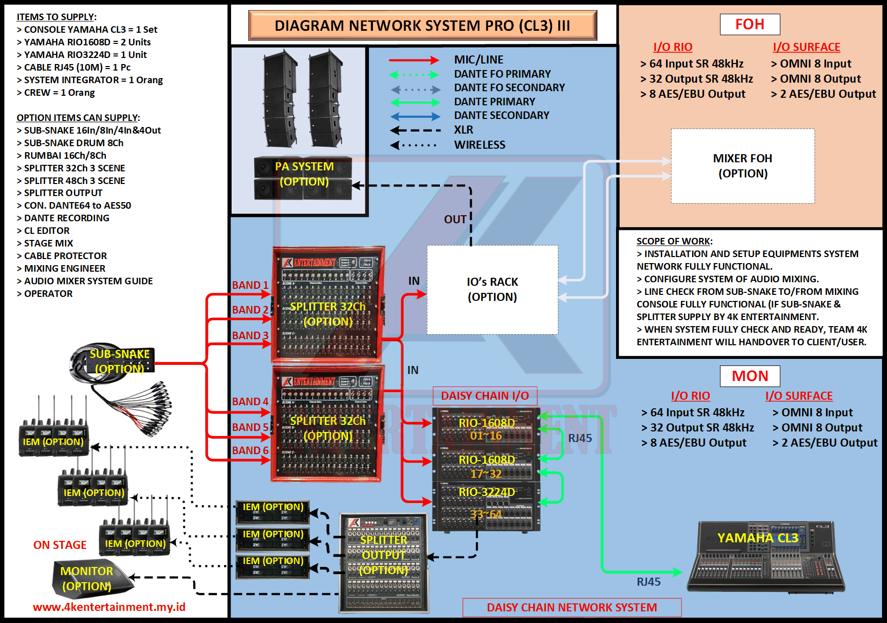 FREE CONSULTATION >> Via Email or WhatsApp SATISFACTION GUARANTEE >> Best Quality, Appearance, Design, Programming, Operator And Services. SERVICE >> Technical Support Available 24H/7D DELIVERY >> T&C To Be Apply HOME SPECIAL OFFER 4K ACADEMY RENTAL – 4K ENTERTAINMENT CUSTOM REQUEST AUDIO MIXING Accessories Digital I/O’s Rack Pkg YAMAHA Pkg MIDAS SOUND SYSTEM IN-EAR MONITOR MICROPHONE COMBINER & SPLITTER BACKLINE DMX-512 LIGHTING SPECIAL EFFECT MULTIMEDIA COMMUNICATION DISC JOCKEY EVENT SUPPORT PARTY EQUIPMENT SAFETY/PROTECTION RIGGING/STAGE MIXING CONSOLES (INFORMATION) MIXER YAMAHA YAMAHA DIGITAL RACK RENTAL EQUIPMENTS ONLY PKG CL3-I Rp POA /Hari PKG CL3-II Rp POA /Hari PKG CL3-III Rp POA /Hari PKG CL3-IV Rp POA /Hari PKG CL5-I Rp POA /Hari PKG CL5-II Rp POA /Hari PKG CL5-III Rp POA /Hari PKG CL5-IV Rp POA /Hari PKG CL5-V Rp POA /Hari PKG CL5-VI Rp POA /Hari PACKAGE MIXING CONSOLES (FOH/MON) - YAMAHA CL3 Pkg (CL3) F/M I Rp POA /Hari Pkg (CL3) F/M II Rp POA /Hari Pkg (CL3) F/M III Rp POA /Hari Pkg (CL3) F/M IV Rp POA /Hari PACKAGE MIXING CONSOLES (FOH/MON) - YAMAHA CL5 Pkg (CL5) F/M I Rp POA /Hari Pkg (CL5) F/M II Rp POA /Hari Pkg (CL5) F/M III Rp POA /Hari Pkg (CL5) F/M IV Rp POA /Hari Pkg (CL5) F/M V Rp POA /Hari Pkg (CL5) F/M VI Rp POA /Hari PACKAGE MIXING CONSOLES PROFESSIONAL (FOH & MONITOR) - YAMAHA CL3 & CL5 Pkg (CL) F&M I Rp POA /Hari Pkg (CL) F&M II Rp POA /Hari Pkg (CL) F&M III Rp POA /Hari Pkg (CL) F&M IV Rp POA /Hari Pkg (CL) F&M V Rp POA /Hari Pkg (CL) F&M VI Rp POA /Hari PACKAGE MIXING CONSOLES PRO EVENT VVIP (FOH & MONITOR) - YAMAHA CL3 & CL5 Pkg (CL-VVIP) F&M A Rp POA /Hari Pkg (CL-VVIP) F&M B Rp POA /Hari Pkg (CL-VVIP) F&M C Rp POA /Hari Pkg (CL-VVIP) F&M D Rp POA /Hari SCOPE OF WORK;> SUPPLY ITEMS As Per AGREED Purchase Order / Agreement.> Installation and Setup System Network Fully Functional.> Configure System Of Audio Mixing> Line Check Digital Snake To/From Mixing Console Fully Functional. If 4K Provide Sub-Snake or Splitter, so Line Check will be included.> When System Fully Check and Ready, Team 4K will handover to CLIENT. If Operator & System Engineer from 4K, 4K will be Responsible for all scope of works. BACA CARA-CARA UNTUK MEMESAN SEWA READ HOW TO BOOK A RENTAL