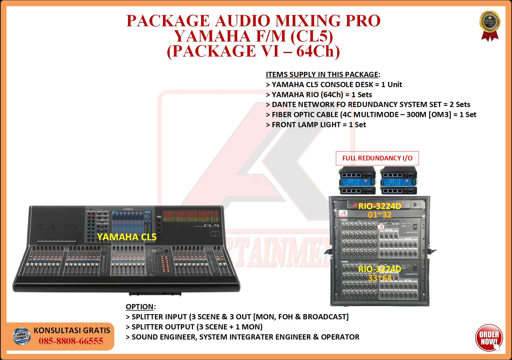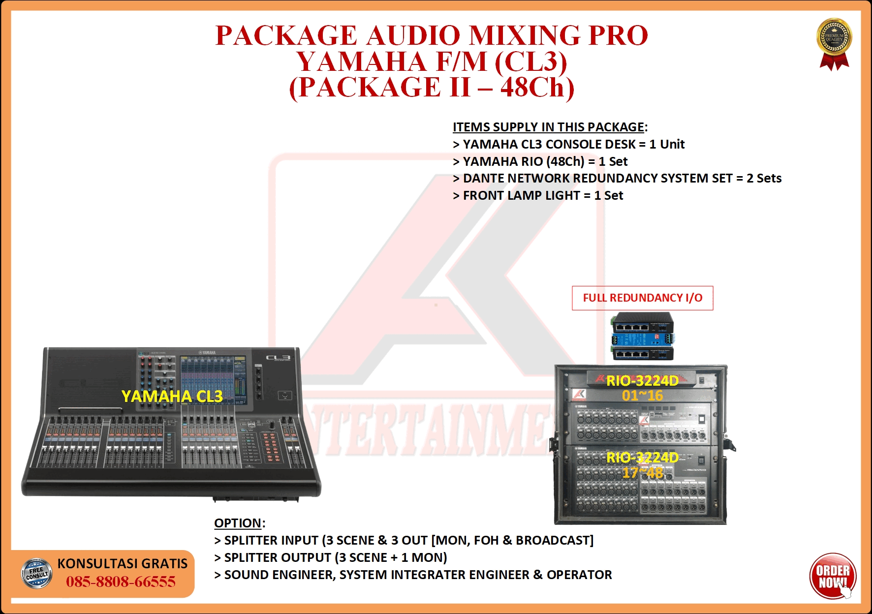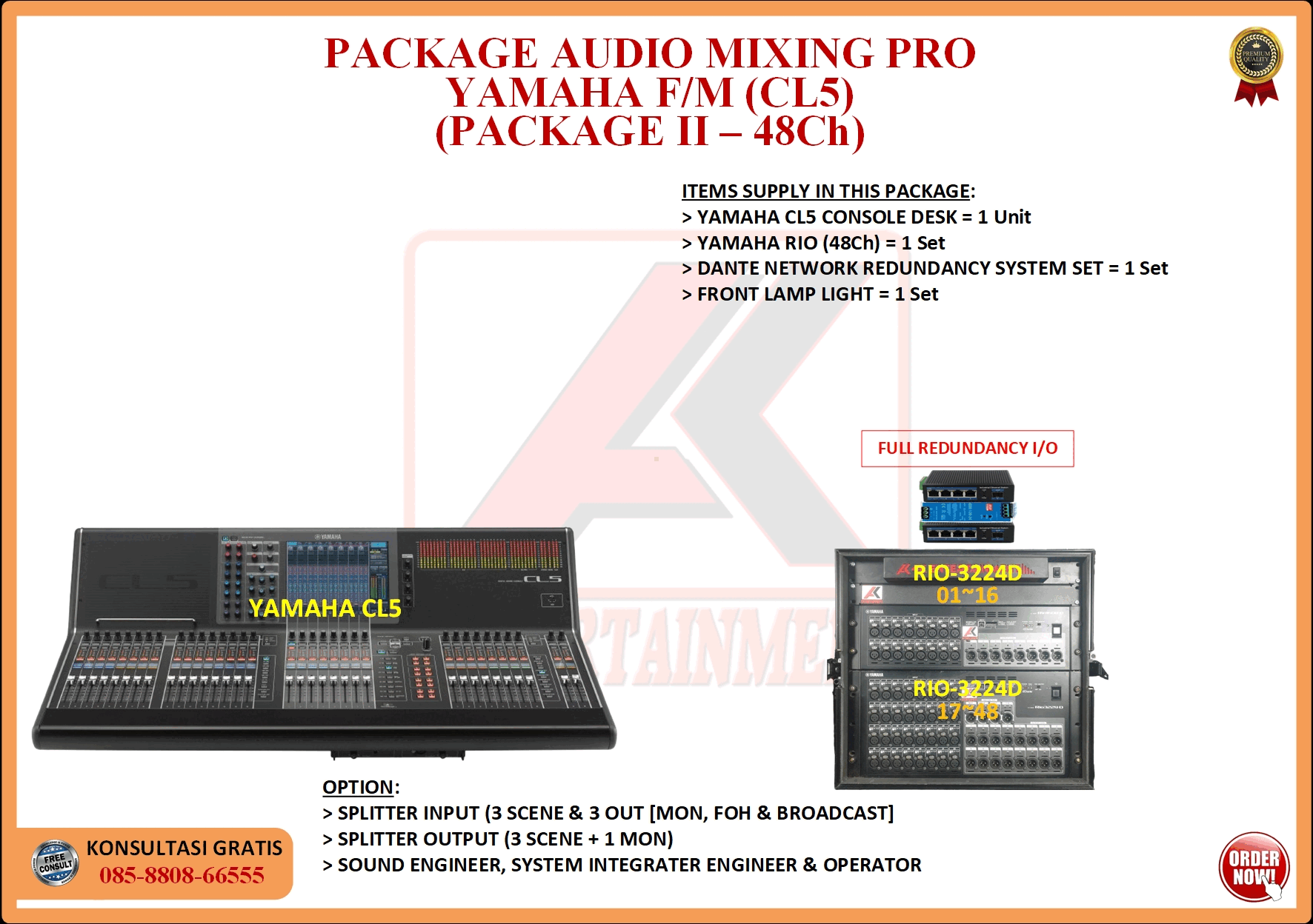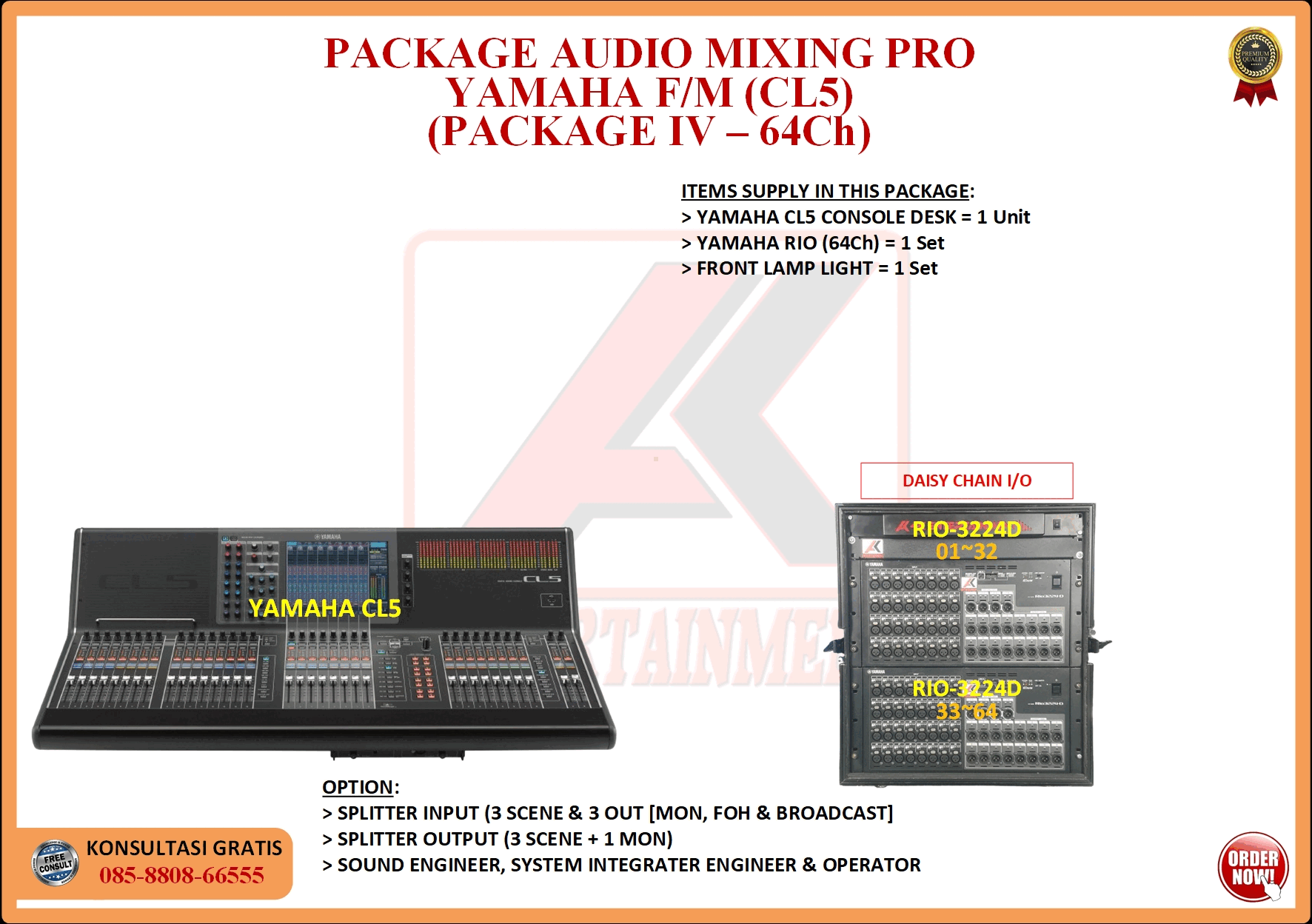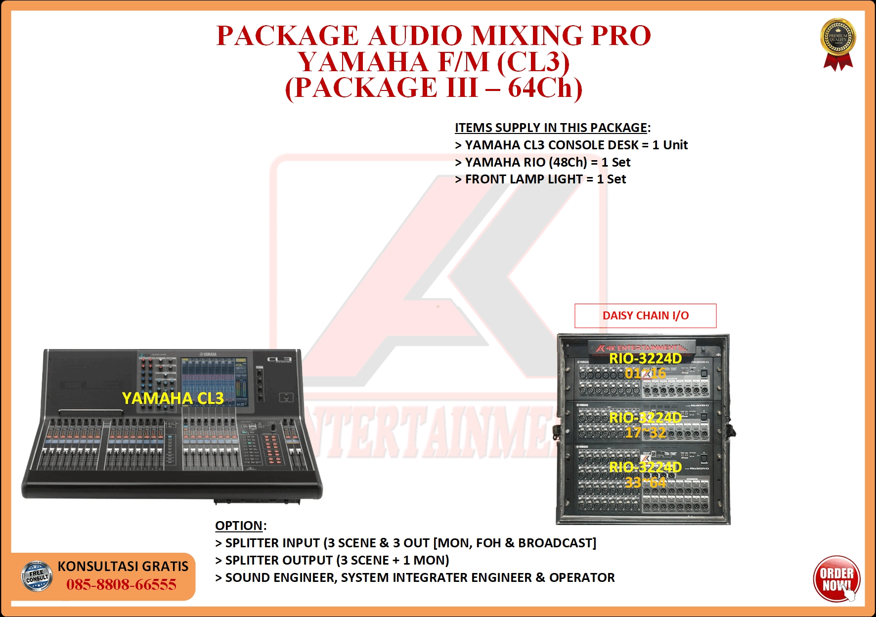FREE CONSULTATION >> Via Email or WhatsApp SATISFACTION GUARANTEE >> Best Quality, Appearance, Design, Programming, Operator And Services. SERVICE >> Technical Support Available 24H/7D DELIVERY >> T&C To Be Apply HOME SPECIAL OFFER 4K ACADEMY RENTAL – 4K ENTERTAINMENT CUSTOM REQUEST AUDIO MIXING Accessories Digital I/O’s Rack Pkg YAMAHA Pkg MIDAS SOUND SYSTEM IN-EAR MONITOR MICROPHONE COMBINER & SPLITTER BACKLINE DMX-512 LIGHTING SPECIAL EFFECT MULTIMEDIA COMMUNICATION DISC JOCKEY EVENT SUPPORT PARTY EQUIPMENT SAFETY/PROTECTION RIGGING/STAGE MIXING CONSOLES (INFORMATION) MIXER YAMAHA YAMAHA DIGITAL RACK RENTAL EQUIPMENTS ONLY PKG CL3-I Rp POA /Hari PKG CL3-II Rp POA /Hari PKG CL3-III Rp POA /Hari PKG CL3-IV Rp POA /Hari PKG CL5-I Rp POA /Hari PKG CL5-II Rp POA /Hari PKG CL5-III Rp POA /Hari PKG CL5-IV Rp POA /Hari PKG CL5-V Rp POA /Hari PKG CL5-VI Rp POA /Hari PACKAGE MIXING CONSOLES (FOH/MON) - YAMAHA CL3 Pkg (CL3) F/M I Rp POA /Hari Pkg (CL3) F/M II Rp POA /Hari Pkg (CL3) F/M III Rp POA /Hari Pkg (CL3) F/M IV Rp POA /Hari PACKAGE MIXING CONSOLES (FOH/MON) - YAMAHA CL5 Pkg (CL5) F/M I Rp POA /Hari Pkg (CL5) F/M II Rp POA /Hari Pkg (CL5) F/M III Rp POA /Hari Pkg (CL5) F/M IV Rp POA /Hari Pkg (CL5) F/M V Rp POA /Hari Pkg (CL5) F/M VI Rp POA /Hari PACKAGE MIXING CONSOLES PROFESSIONAL (FOH & MONITOR) - YAMAHA CL3 & CL5 Pkg (CL) F&M I Rp POA /Hari Pkg (CL) F&M II Rp POA /Hari Pkg (CL) F&M III Rp POA /Hari Pkg (CL) F&M IV Rp POA /Hari Pkg (CL) F&M V Rp POA /Hari Pkg (CL) F&M VI Rp POA /Hari PACKAGE MIXING CONSOLES PRO EVENT VVIP (FOH & MONITOR) - YAMAHA CL3 & CL5 Pkg (CL-VVIP) F&M A Rp POA /Hari Pkg (CL-VVIP) F&M B Rp POA /Hari Pkg (CL-VVIP) F&M C Rp POA /Hari Pkg (CL-VVIP) F&M D Rp POA /Hari SCOPE OF WORK;> SUPPLY ITEMS As Per AGREED Purchase Order / Agreement.> Installation and Setup System Network Fully Functional.> Configure System Of Audio Mixing> Line Check Digital Snake To/From Mixing Console Fully Functional. If 4K Provide Sub-Snake or Splitter, so Line Check will be included.> When System Fully Check and Ready, Team 4K will handover to CLIENT. If Operator & System Engineer from 4K, 4K will be Responsible for all scope of works. BACA CARA-CARA UNTUK MEMESAN SEWA READ HOW TO BOOK A RENTAL