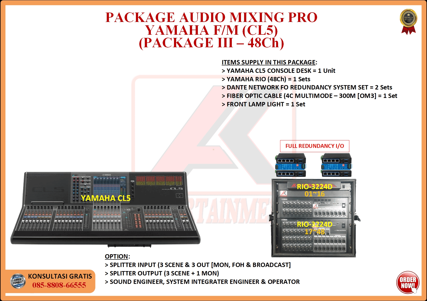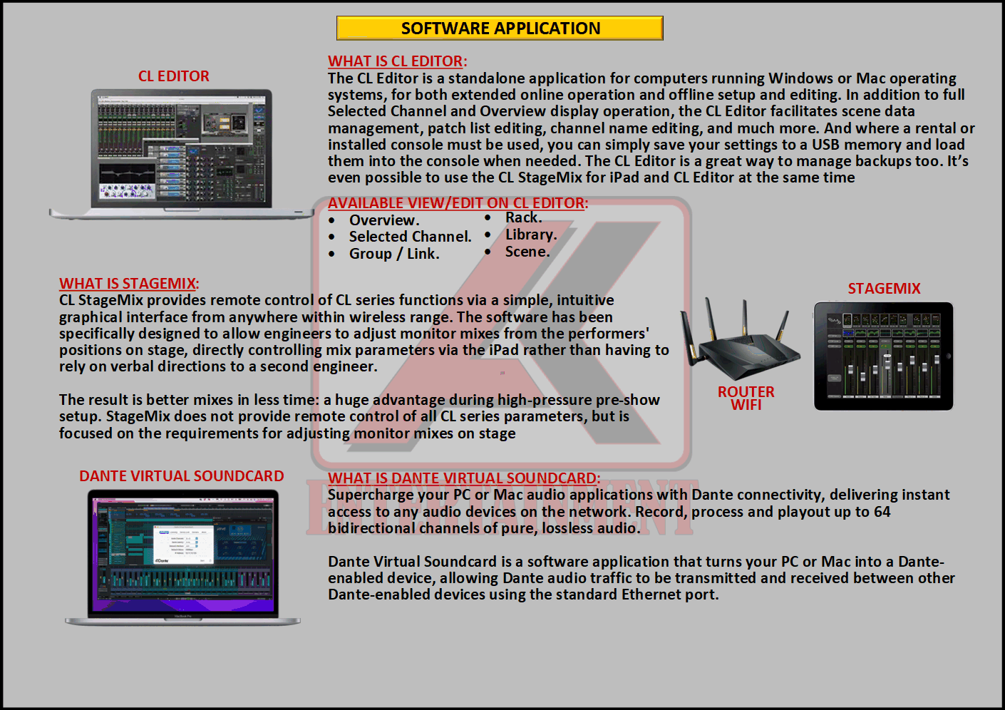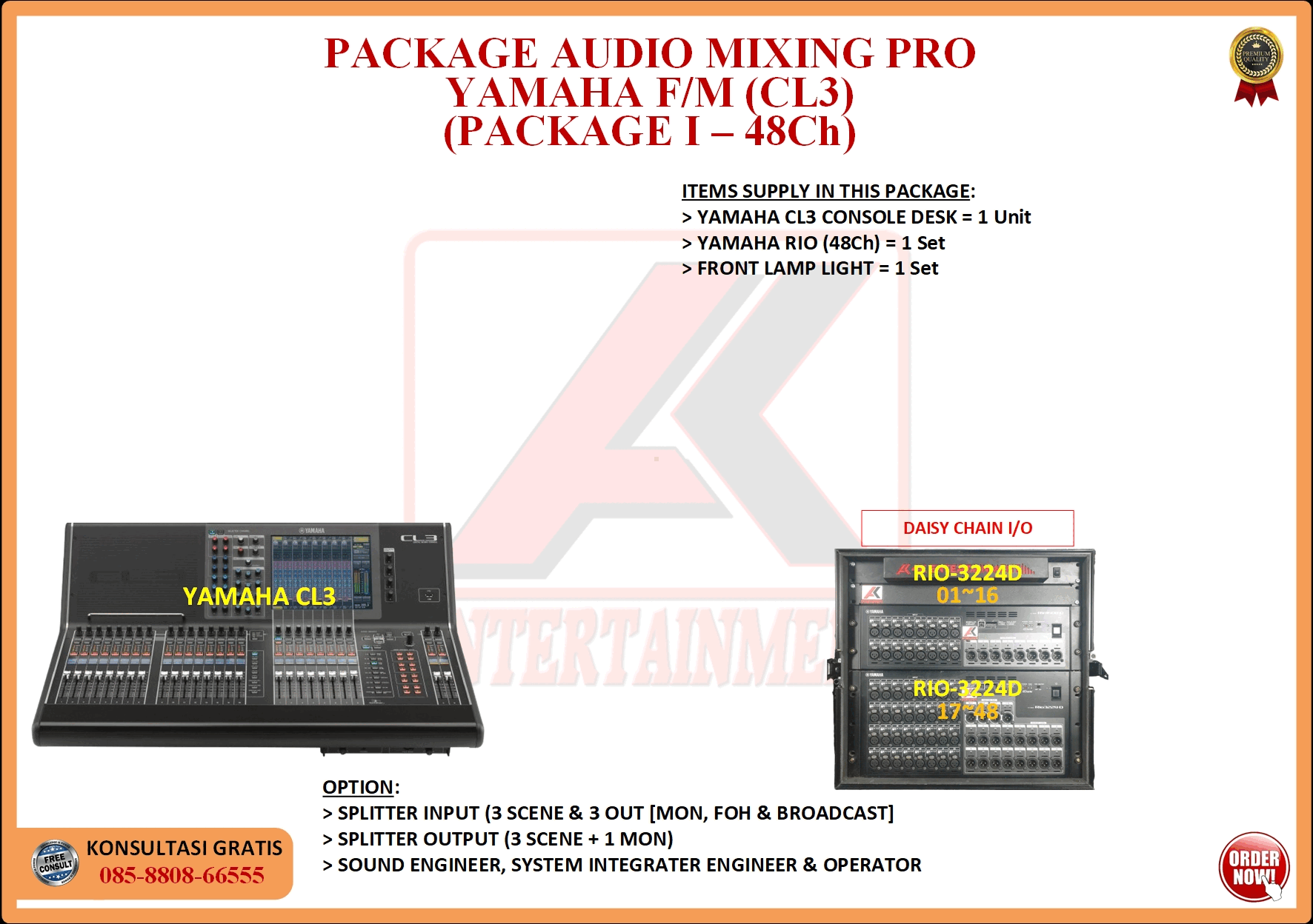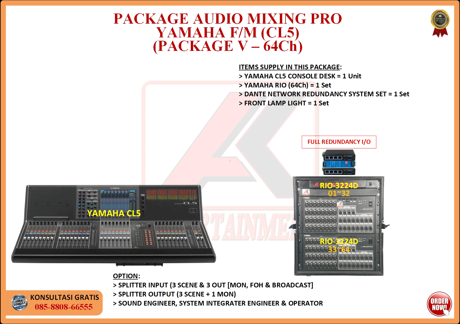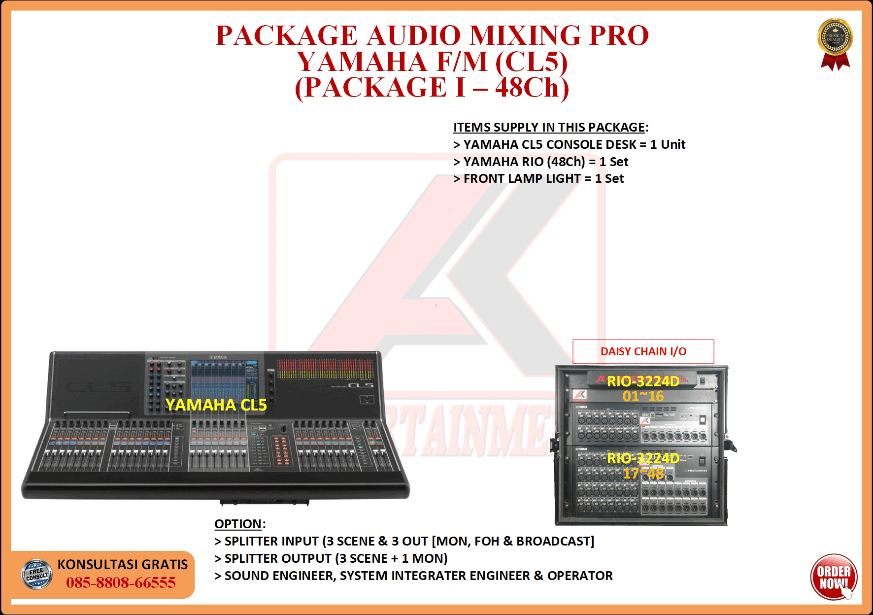 FREE CONSULTATION >> Via Email or WhatsApp SATISFACTION GUARANTEE >> Best Quality, Appearance, Design, Programming, Operator And Services. SERVICE >> Technical Support Available 24H/7D DELIVERY >> T&C To Be Apply HOME SPECIAL OFFER 4K ACADEMY RENTAL – 4K ENTERTAINMENT CUSTOM REQUEST AUDIO MIXING Accessories Digital I/O’s Rack Pkg YAMAHA Pkg MIDAS SOUND SYSTEM IN-EAR MONITOR MICROPHONE COMBINER & SPLITTER BACKLINE DMX-512 LIGHTING SPECIAL EFFECT MULTIMEDIA COMMUNICATION DISC JOCKEY EVENT SUPPORT PARTY EQUIPMENT SAFETY/PROTECTION RIGGING/STAGE MIXING CONSOLES (INFORMATION) MIXER YAMAHA YAMAHA DIGITAL RACK RENTAL EQUIPMENTS ONLY PKG CL3-I Rp POA /Hari PKG CL3-II Rp POA /Hari PKG CL3-III Rp POA /Hari PKG CL3-IV Rp POA /Hari PKG CL5-I Rp POA /Hari PKG CL5-II Rp POA /Hari PKG CL5-III Rp POA /Hari PKG CL5-IV Rp POA /Hari PKG CL5-V Rp POA /Hari PKG CL5-VI Rp POA /Hari PACKAGE MIXING CONSOLES (FOH/MON) - YAMAHA CL3 Pkg (CL3) F/M I Rp POA /Hari Pkg (CL3) F/M II Rp POA /Hari Pkg (CL3) F/M III Rp POA /Hari Pkg (CL3) F/M IV Rp POA /Hari PACKAGE MIXING CONSOLES (FOH/MON) - YAMAHA CL5 Pkg (CL5) F/M I Rp POA /Hari Pkg (CL5) F/M II Rp POA /Hari Pkg (CL5) F/M III Rp POA /Hari Pkg (CL5) F/M IV Rp POA /Hari Pkg (CL5) F/M V Rp POA /Hari Pkg (CL5) F/M VI Rp POA /Hari PACKAGE MIXING CONSOLES PROFESSIONAL (FOH & MONITOR) - YAMAHA CL3 & CL5 Pkg (CL) F&M I Rp POA /Hari Pkg (CL) F&M II Rp POA /Hari Pkg (CL) F&M III Rp POA /Hari Pkg (CL) F&M IV Rp POA /Hari Pkg (CL) F&M V Rp POA /Hari Pkg (CL) F&M VI Rp POA /Hari PACKAGE MIXING CONSOLES PRO EVENT VVIP (FOH & MONITOR) - YAMAHA CL3 & CL5 Pkg (CL-VVIP) F&M A Rp POA /Hari Pkg (CL-VVIP) F&M B Rp POA /Hari Pkg (CL-VVIP) F&M C Rp POA /Hari Pkg (CL-VVIP) F&M D Rp POA /Hari SCOPE OF WORK;> SUPPLY ITEMS As Per AGREED Purchase Order / Agreement.> Installation and Setup System Network Fully Functional.> Configure System Of Audio Mixing> Line Check Digital Snake To/From Mixing Console Fully Functional. If 4K Provide Sub-Snake or Splitter, so Line Check will be included.> When System Fully Check and Ready, Team 4K will handover to CLIENT. If Operator & System Engineer from 4K, 4K will be Responsible for all scope of works. BACA CARA-CARA UNTUK MEMESAN SEWA READ HOW TO BOOK A RENTAL